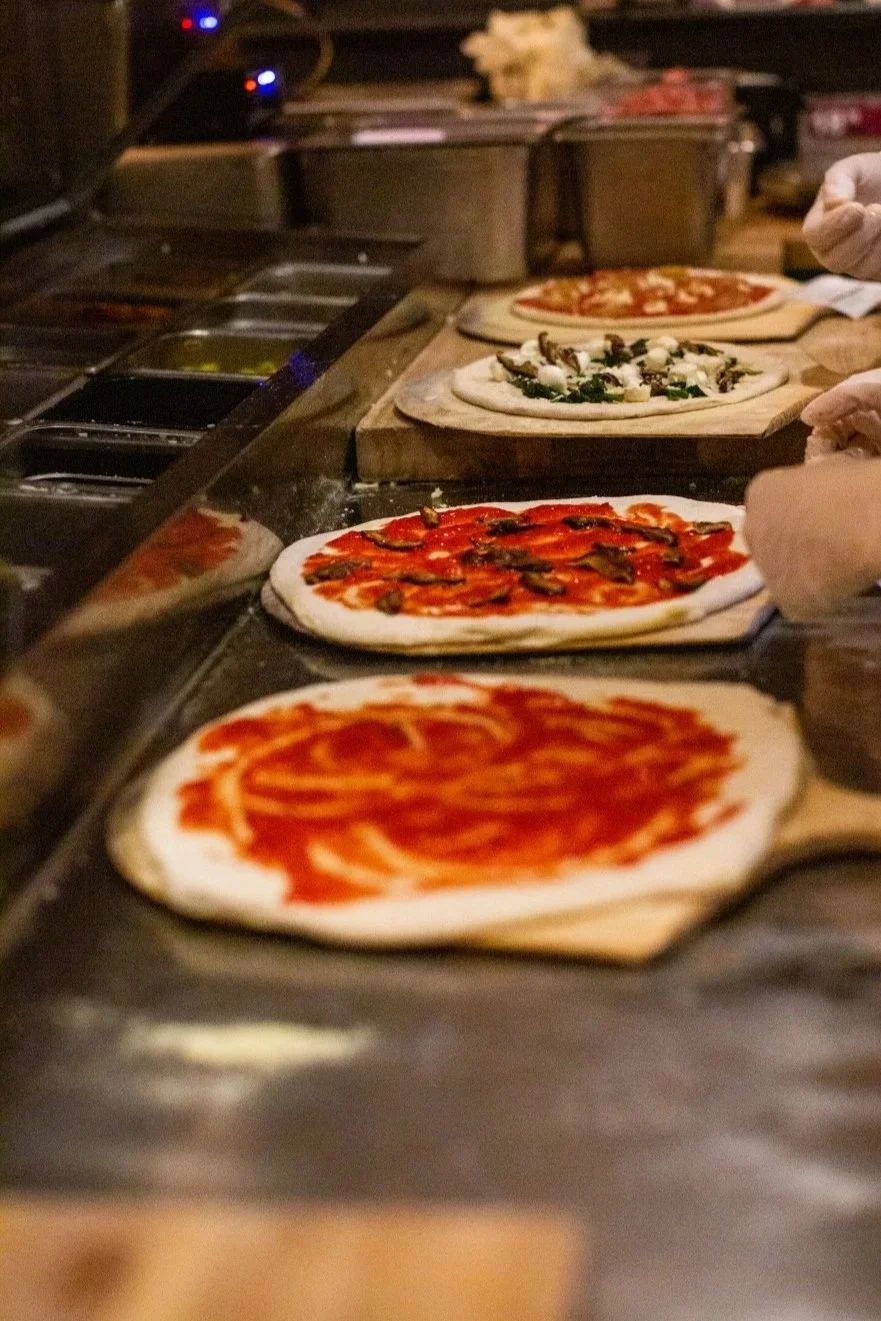 Second, our pies receive their ingredients, sourced from neighboring farms. Our toppings are the stars of the show! Our dough is made daily from a natural leaven (sourdough starter), and baked in our wood-fired brick Mugnaini oven.